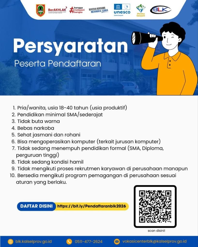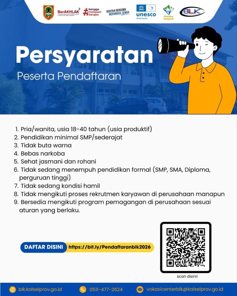 Untuk informasi selanjutnya, BLK Kalsel menympaikan bahwa Pendaftaran dilakukan secara daring melalui, https://bit.ly/Pendaftaranblk2026, atau mengunjungi media sosial (Instagram) resmi BLK Kalsel https://www.instagram.com/blk_banjarbaru_prov_kalsel/. MC Kalsel/Fuz
