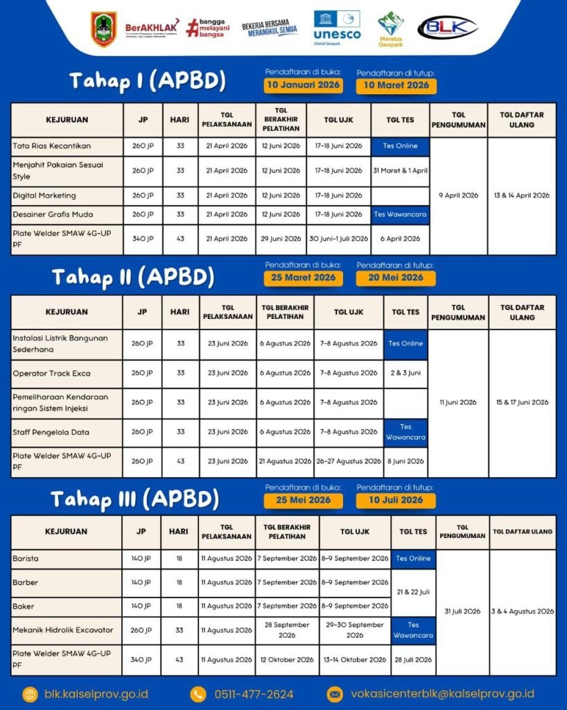 Tahap II (APBD), Pendaftaran dibuka 25 Maret – 20 Mei 2026 dengan kejuruan: Instalasi Listrik Bangunan Sederhana, Operator Track Excavator, Pemeliharaan Kendaraan Ringan Sistem Injeksi, Staff Pengelola Data dan Plate Welder SMAW 4G-UP PF