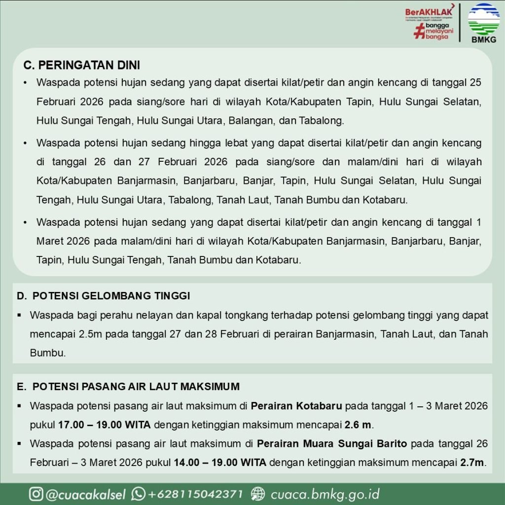 BMKG juga mengeluarkan peringatan dini terhadap potensi hujan sedang hingga lebat yang dapat disertai kilat/petir dan angin kencang. Pada 25 Februari 2026 siang hingga sore hari, potensi tersebut diprakirakan terjadi di Tapin, Hulu Sungai Selatan, Hulu Sungai Tengah, Hulu Sungai Utara, Balangan, dan Tabalong.