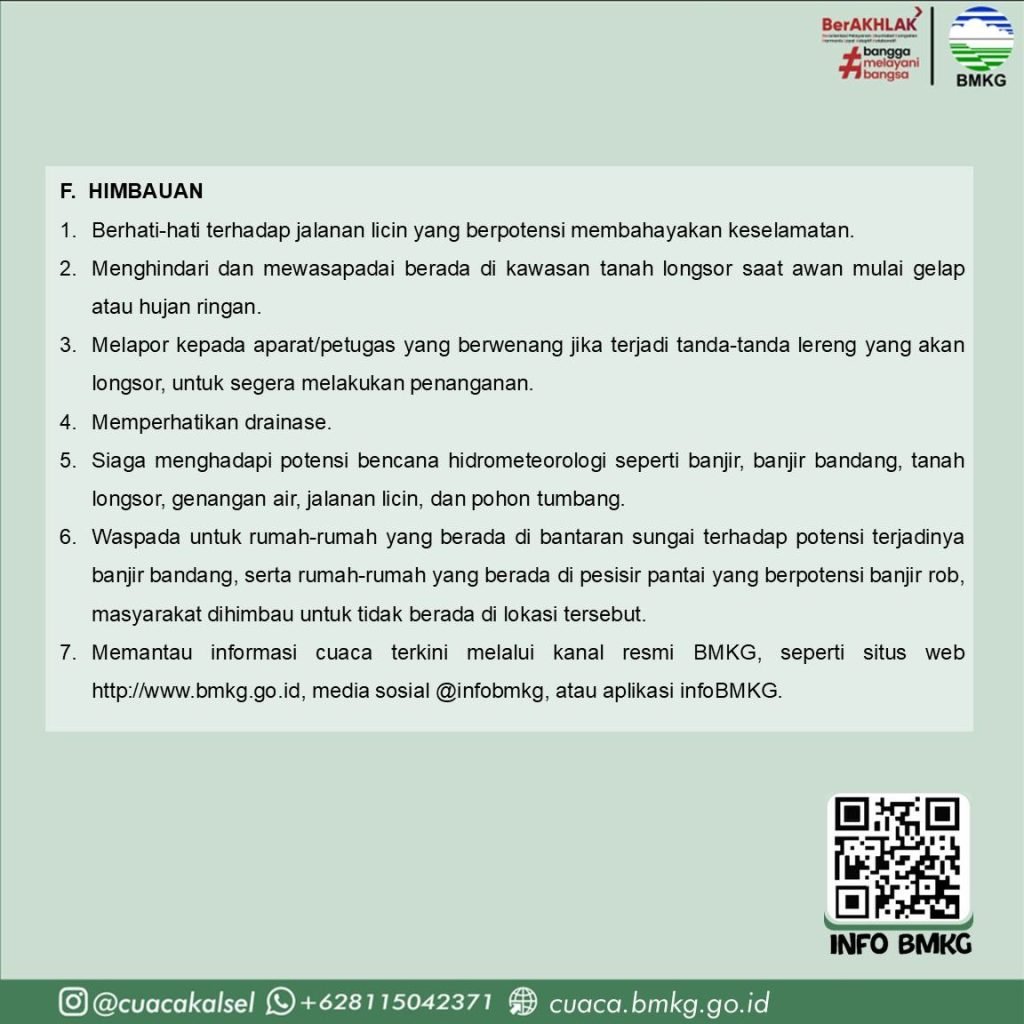 “Masyarakat diimbau berhati-hati terhadap jalan licin, potensi banjir, banjir bandang, tanah longsor, genangan air, serta pohon tumbang. Warga yang bermukim di bantaran sungai dan pesisir pantai juga diminta meningkatkan kewaspadaan terhadap potensi banjir dan banjir rob,” terangnya.