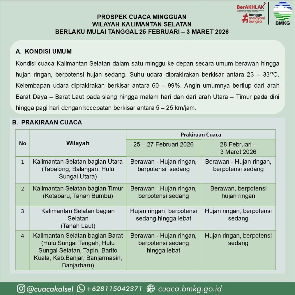 Untuk periode 25–27 Februari 2026, wilayah Kalimantan Selatan bagian Utara (Tabalong, Balangan, Hulu Sungai Utara), Timur (Kotabaru, Tanah Bumbu), dan Barat (Hulu Sungai Tengah, Hulu Sungai Selatan, Tapin, Barito Kuala, Kabupaten Banjar, Banjarmasin, Banjarbaru) diprakirakan berawan hingga hujan ringan dengan potensi hujan sedang.