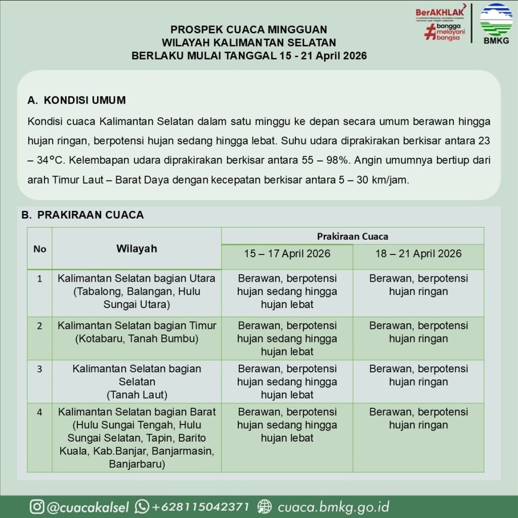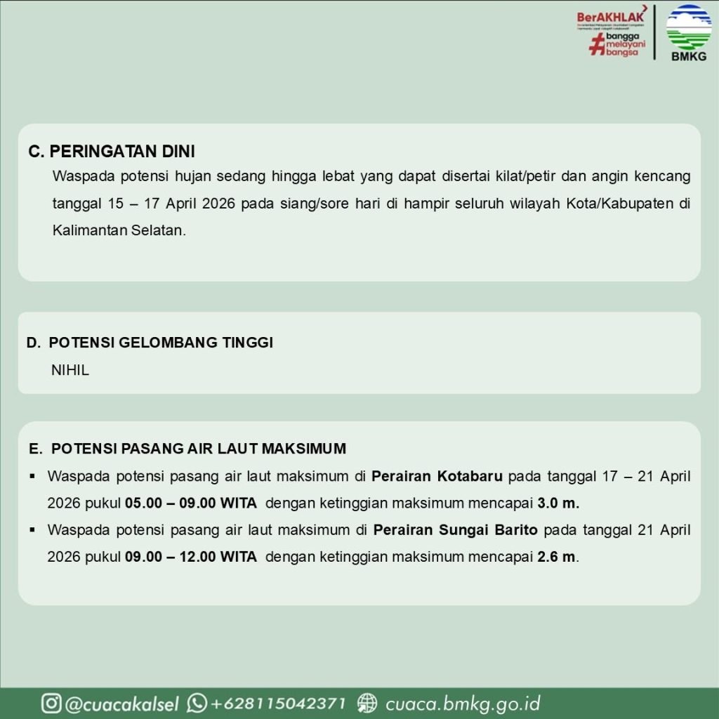 BMKG juga mengeluarkan peringatan dini terkait potensi hujan sedang hingga lebat yang dapat disertai kilat atau petir serta angin kencang, khususnya pada siang hingga sore hari di hampir seluruh wilayah kabupaten/kota di Kalimantan Selatan pada periode 15–17 April 2026.
