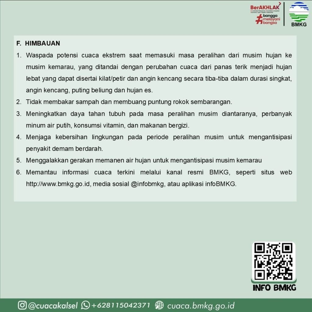 BMKG juga mengimbau masyarakat untuk aktif memantau informasi cuaca terkini melalui kanal resmi BMKG, seperti aplikasi Info BMKG, situs web https://cuaca.bmkg.go.id/, serta media sosial Instagram @cuacakalsel.