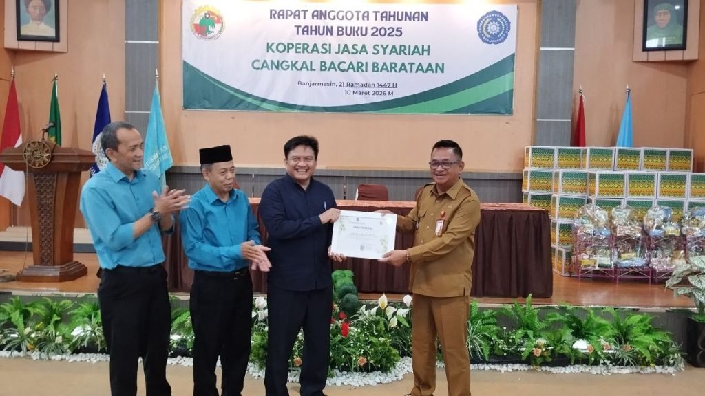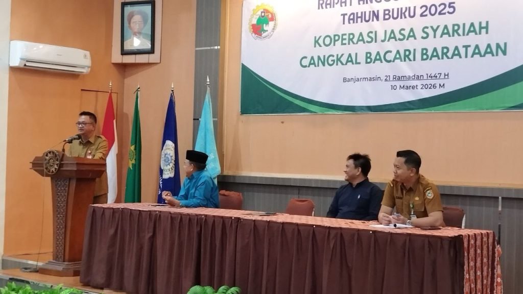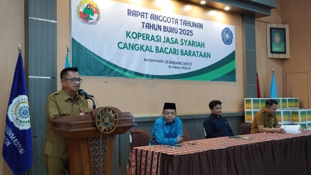 Pelaksana Tugas (Plt) Kepala Dinas Koperasi dan UKM Provinsi Kalimantan Selatan, H Ahmad Bagiawan, mengapresiasi pelaksanaan Rapat Anggota Tahunan (RAT) Tahun Buku 2025 Koperasi Jasa Syariah Cangkal Bacari Barataan Universitas Muhammadiyah Banjarmasin, Selasa (10/3/2026).