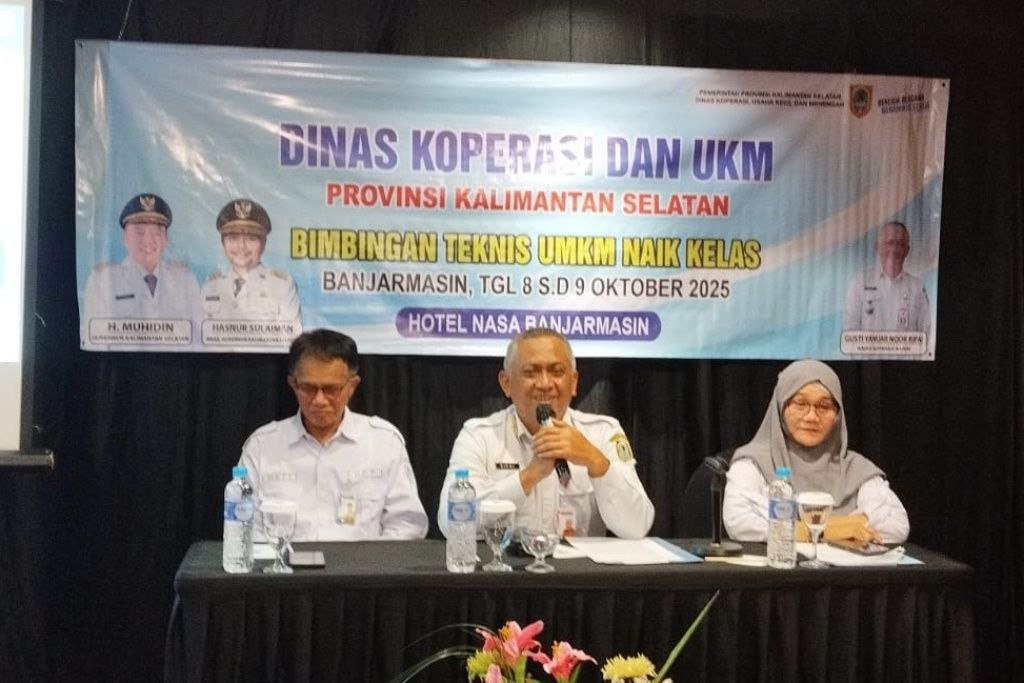 Pemerintah Provinsi Kalimantan Selatan terus berupaya memperkuat daya saing pelaku Usaha Mikro, Kecil, dan Menengah (UMKM) agar mampu bertahan dan tumbuh di era digital. Hal ini disampaikan Kepala Dinas Koperasi dan UKM Provinsi Kalimantan Selatan, Drs. Gusti Yanuar Noor Rifai, M.Si, saat membuka kegiatan Bimbingan Teknis (Bimtek) UMKM Naik Kelas, yang digelar pada 8–9 Oktober 2025 di salah satu hotel di Banjarmasin.