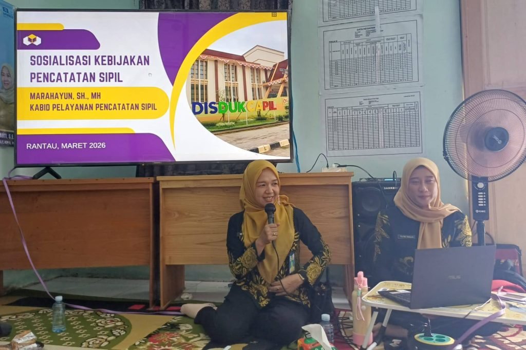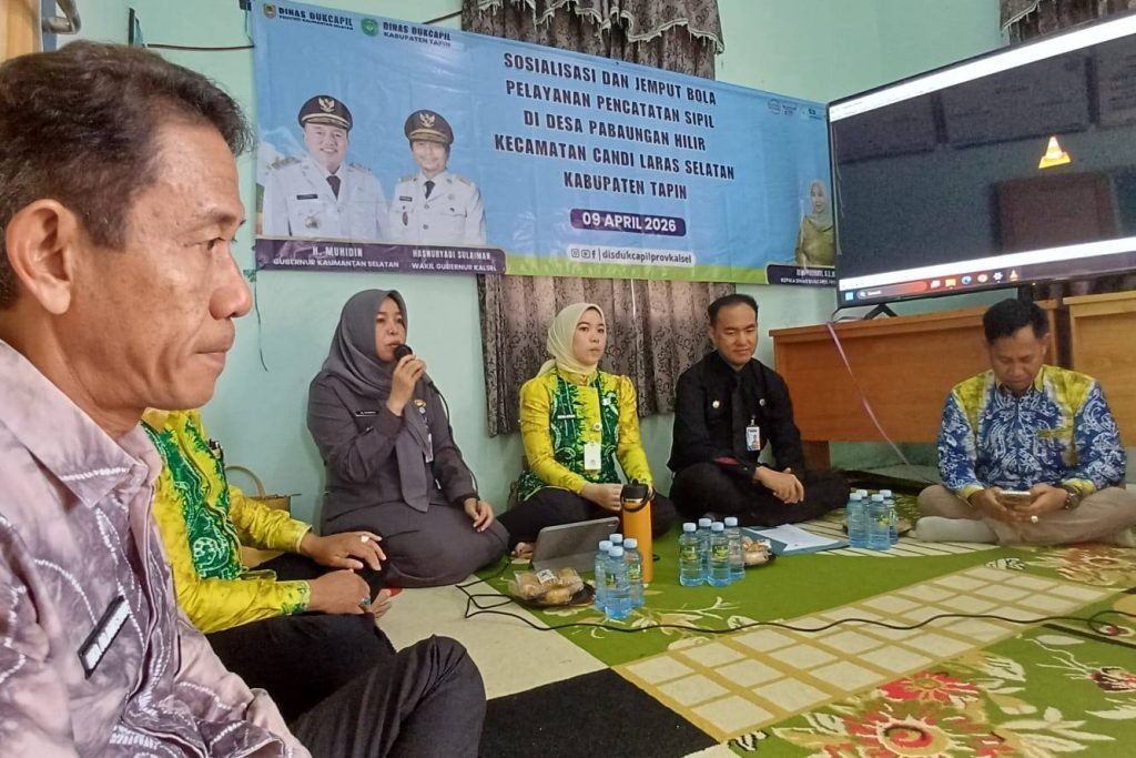 Pemerintah Provinsi Kalimantan Selatan melalui Dinas Kependudukan dan Pencatatan Sipil (Disdukcapil) Provinsi Kalsel berkolaborasi dengan Disdukcapil Kabupaten Tapin menghadirkan layanan administrasi kependudukan (adminduk) dengan metode jemput bola di Desa Pabaungan Hilir, Kecamatan Candi Laras Selatan, Kamis (9/4/2026).