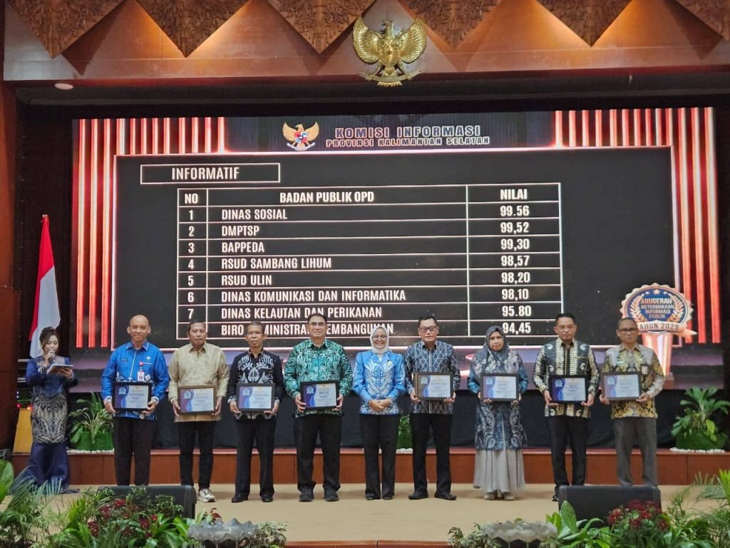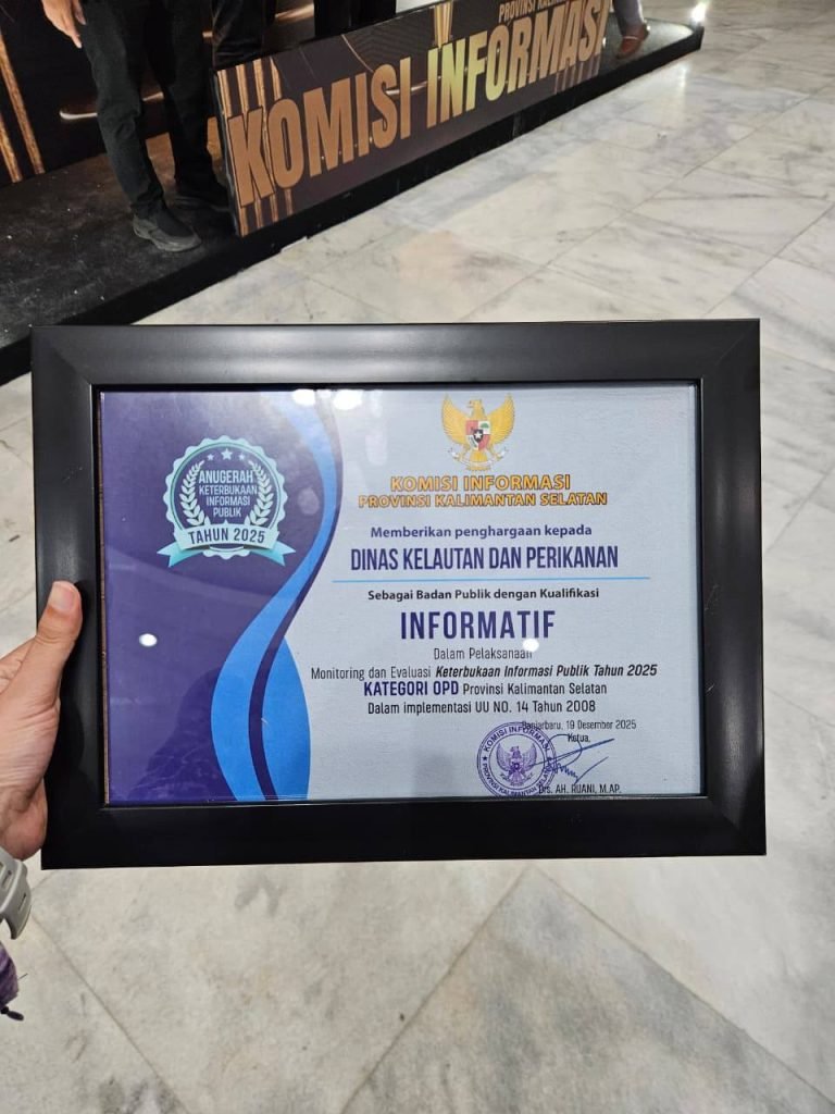 Dinas Kelautan dan Perikanan (DKP) Provinsi Kalimantan Selatan meraih Penghargaan Kategori Informatif pada Anugerah Keterbukaan Informasi Publik Tahun 2025 yang diselenggarakan oleh Komisi Informasi Provinsi Kalimantan Selatan. Penghargaan ini diberikan sebagai bentuk apresiasi atas komitmen dan kinerja DKP dalam melaksanakan monitoring dan evaluasi keterbukaan informasi publik, khususnya dalam implementasi Undang-Undang Nomor 14 Tahun 2008 tentang Keterbukaan Informasi Publik.