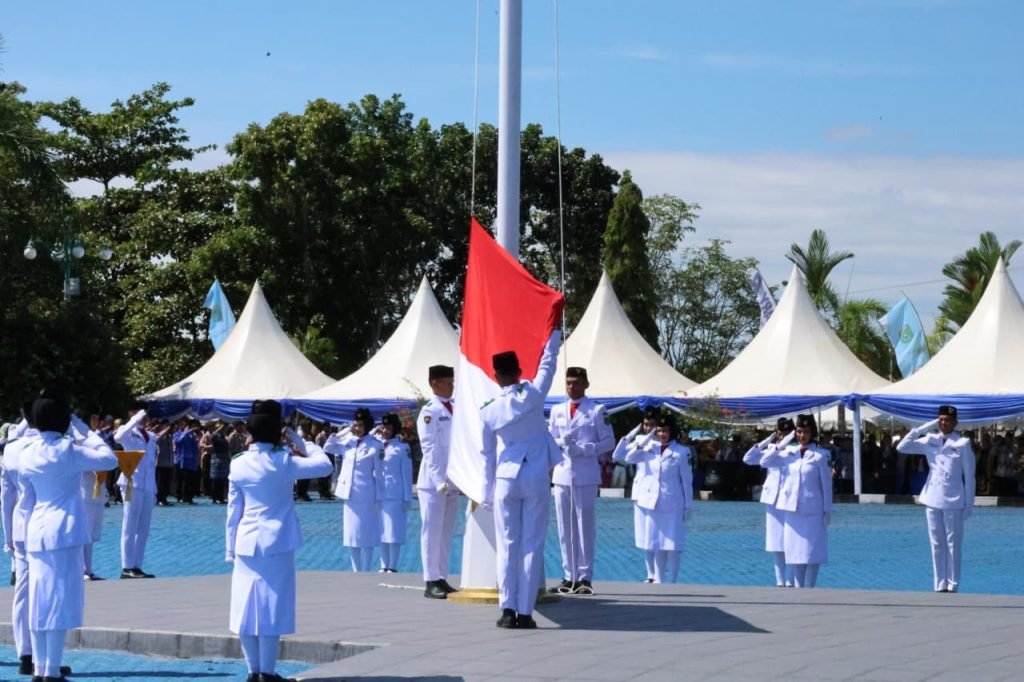 Petugas pengibar bendera adalah Putra Puteri terbaik Tanah Bumbu dibawah binaan Bakesbangpol Tanah Bumbu.