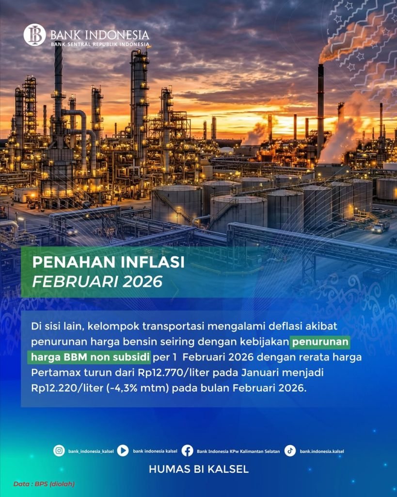 Di sisi lain, tekanan inflasi pada Februari 2026 turut tertahan oleh penurunan harga pada sektor transportasi. Kelompok transportasi tercatat mengalami deflasi, seiring dengan turunnya harga bensin setelah kebijakan penurunan harga BBM non-subsidi yang berlaku sejak 1 Februari 2026.