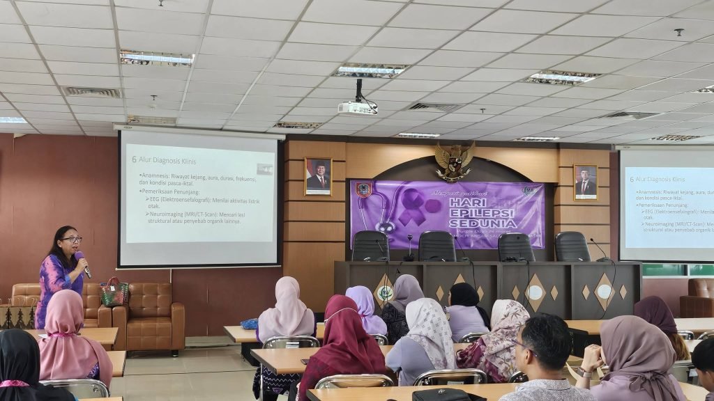 Dalam pemaparannya, ia menjelaskan penanganan epilepsi dari berbagai sudut pandang, baik medis maupun sosial, sekaligus membuka ruang diskusi interaktif bagi peserta.