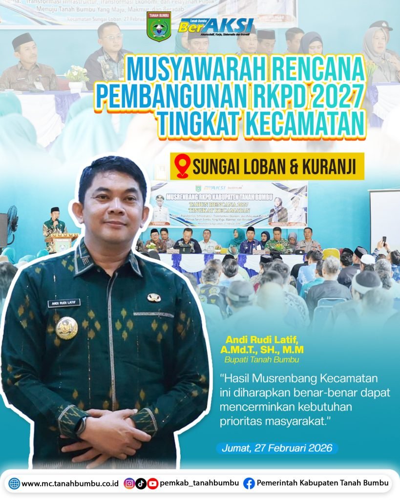 BATULICIN – Pemerintah Kabupaten Tanah Bumbu ( Tanbu) menggelar Musyawarah Perencanaan Pembangunan (Musrenbang) Rencana Kerja Pemerintah Daerah (RKPD) Kecamatan tahun 2027 di dua kecamatan sekaligus. Yakni Kecamatan Sungai Loban dan Kecamatan Kuranji, Jumat (27/02/2026).