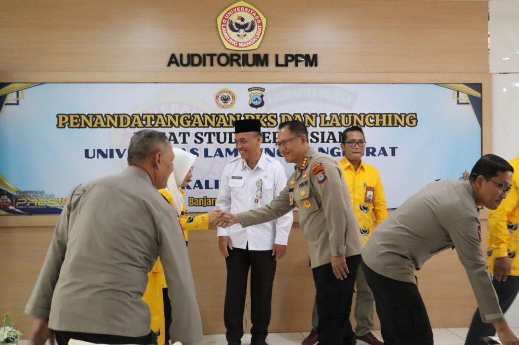 Pemerintah Provinsi Kalimantan Selatan menyambut baik penandatanganan Perjanjian Kerja Sama (PKS) antara Polda Kalimantan Selatan dengan Universitas Lambung Mangkurat (ULM) sekaligus launching Pusat Studi Kepolisian yang dilaksanakan di Auditorium LPPM ULM Banjarmasin, Rabu (11/3/2026).