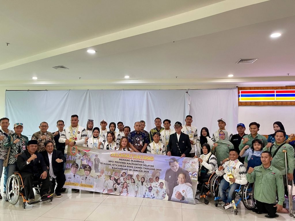 Haru dan kebanggaan menyelimuti Bandara Internasional Syamsuddin Noor, Banjarbaru, Kamis (29/1/2026), saat para atlet National Paralympic Committee (NPC) Provinsi Kalimantan Selatan tiba kembali ke tanah air usai menorehkan prestasi gemilang di ajang ASEAN Para Games Thailand 2026.