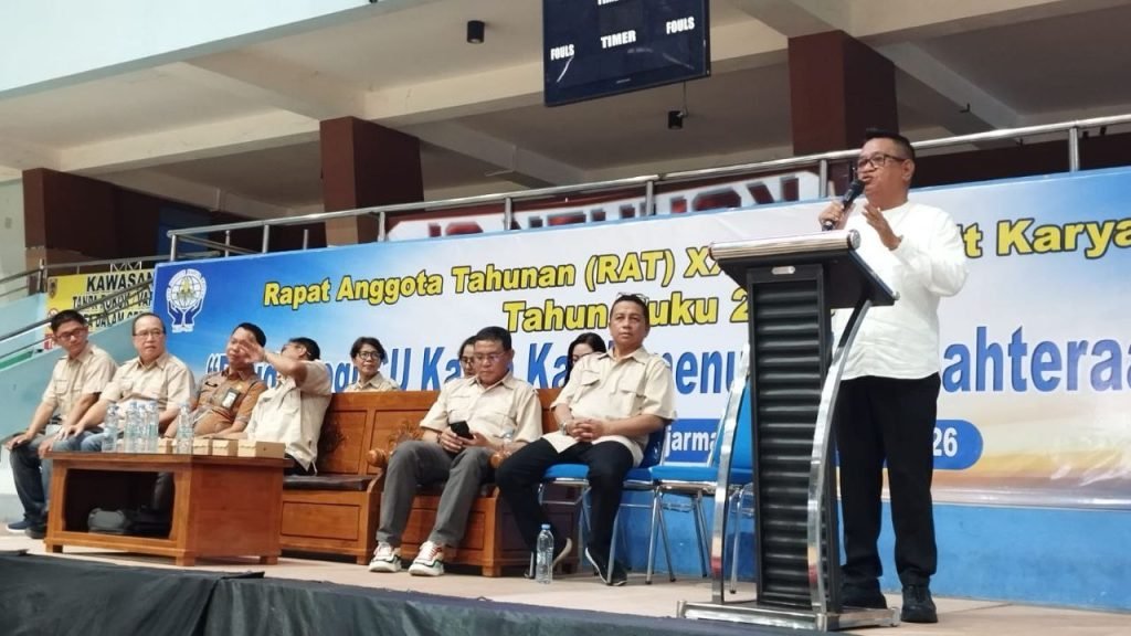 Pelaksana Tugas (Plt) Kepala Dinas Koperasi dan UKM Provinsi Kalimantan Selatan, Ahmad Bagiawan, menghadiri Rapat Anggota Tahunan (RAT) KSP Kopdit Karya Kasih di GOR Hasanuddin HM, Minggu (15/2/2026).