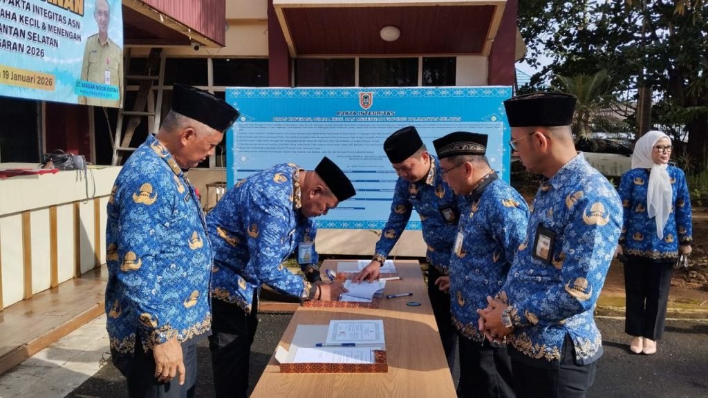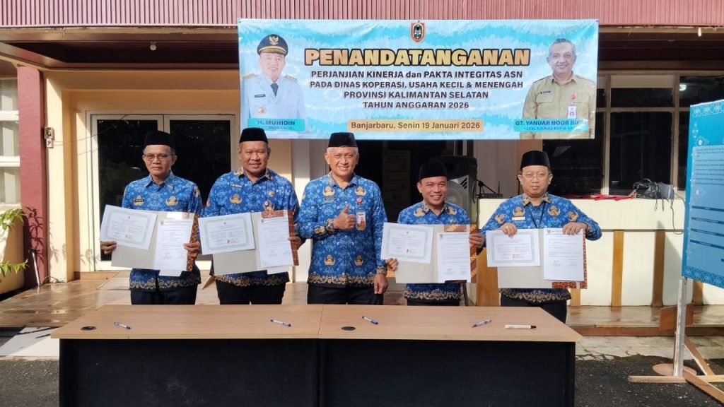 Dinas Koperasi dan Usaha Mikro, Kecil, dan Menengah (UMKM) Provinsi Kalimantan Selatan menegaskan komitmennya terhadap pencegahan korupsi melalui penandatanganan Pakta Integritas Tahun Anggaran 2026, Senin (19/1/2026) dan diikuti oleh seluruh pejabat struktural dan fungsional di lingkungan Dinas Koperasi dan UKM Provinsi Kalsel.