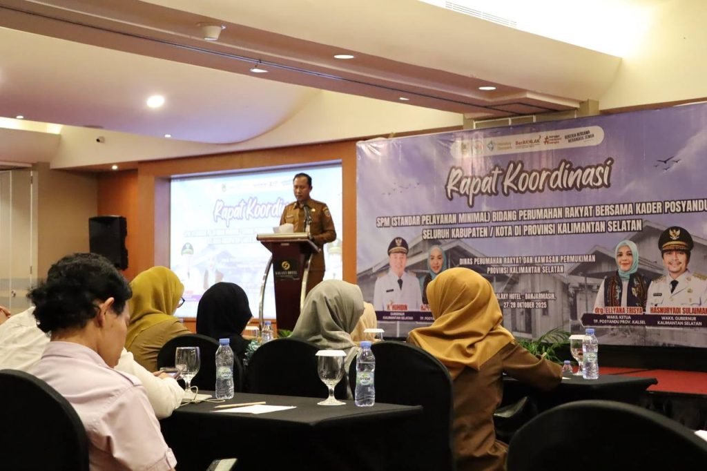 Dinas Perumahan Rakyat dan Kawasan Permukiman Provinsi Kalimantan Selatan (Kalsel) berkolaborasi dengan Tim Penggerak Posyandu Provinsi Kalimantan Selatan (TP Posyandu Kalsel) menggelar Rapat Koordinasi implementasi Standar Pelayanan Minimal (SPM) bidang Perumahan Rakyat di tingkat daerah di Banjarmasin, Senin (27/10/2025).
