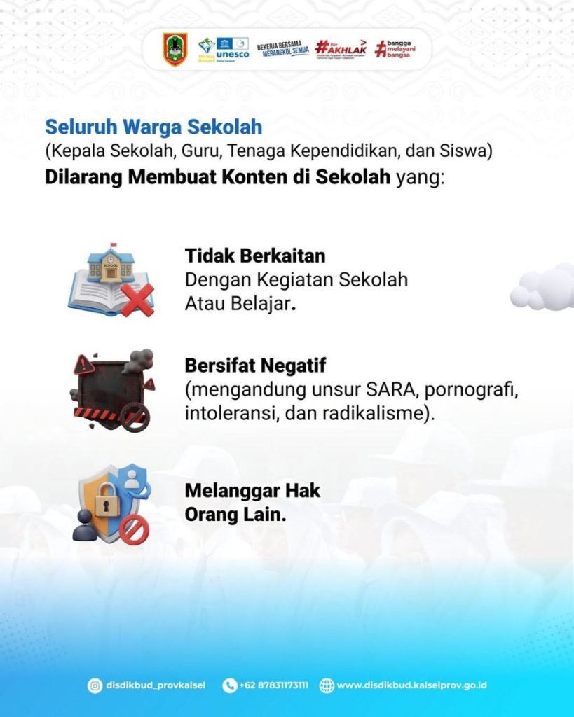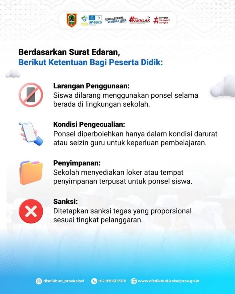Dinas Pendidikan dan Kebudayaan (Disdikbud) Provinsi Kalimantan Selatan resmi memberlakukan kebijakan pembatasan penggunaan telepon seluler (ponsel) di lingkungan sekolah. Kebijakan tersebut tertuang dalam Surat Edaran Nomor 4 Tahun 2026 yang ditujukan kepada seluruh kepala SMA, SMK, dan SLB di wilayah Kalimantan Selatan.